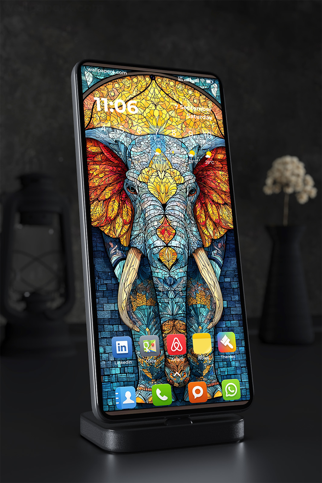 A striking stained glass illustration of an elephant, crafted with intricate mosaic details and vibrant color transitions. The symmetrical composition and decorative patterns create a sense of harmony, making it a visually captivating piece for any mobile screen.